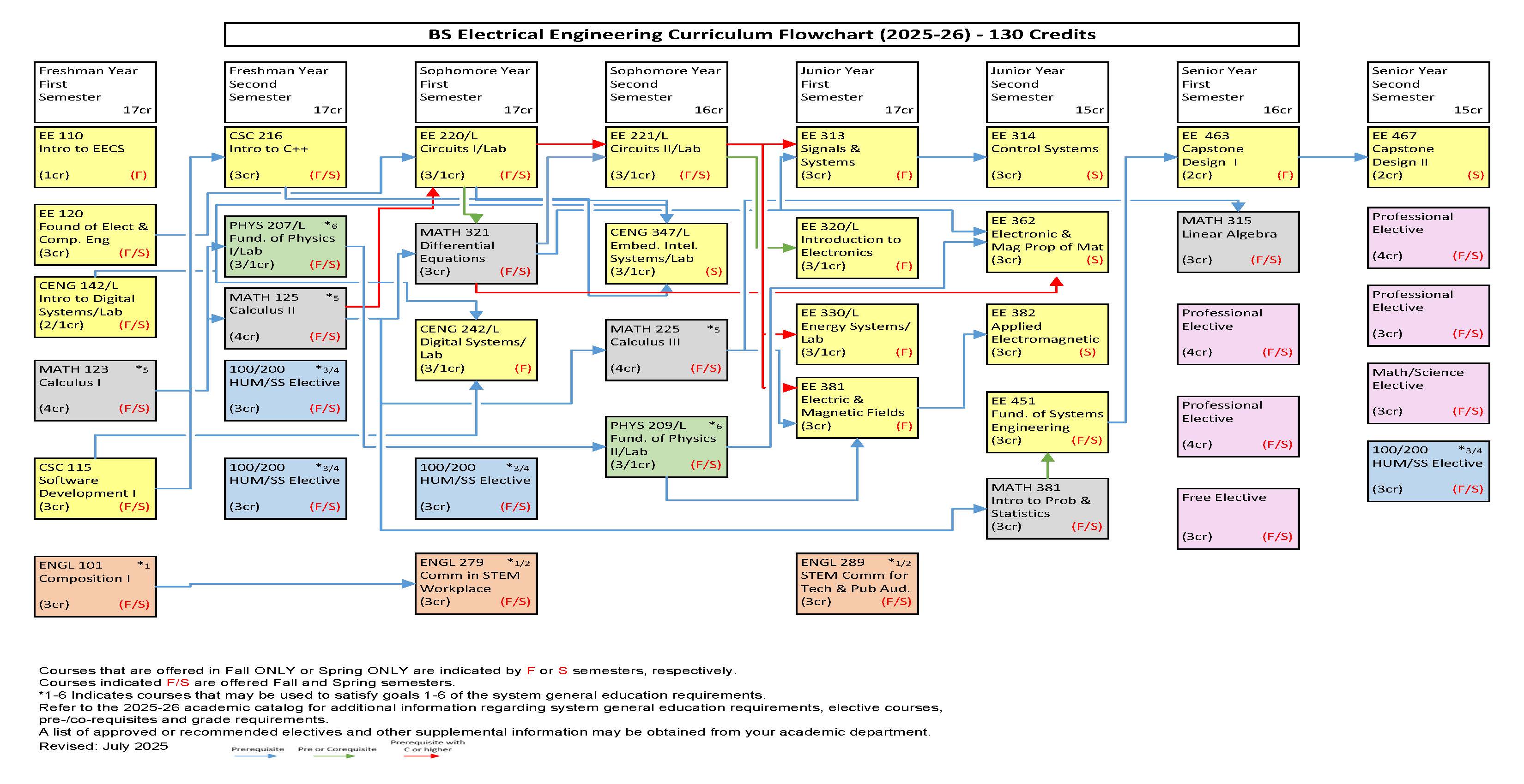 1 Fulfills General Education requirement. Students should consult the “General Education Requirements” section of this catalog for a complete listing of all general education requirements. 2 Select three credits from the following list: CHEM 112 ; MATH 251 , MATH 353 , MATH 373 , MATH 382 , MATH 415 , MATH 421 , MATH 432 , MATH 443 , MATH 447 , MATH 451 ; PHYS 225, PHYS 275, PHYS 331, PHYS 361, PHYS 421, or PHYS 451 3 Select 15 credits from any EE 4xx, 5xx, or 6xx courses with the exception of EE 451 , CENG 463/ CSC 463/ EE 463 , and CENG 467 /CSC 467 /EE 467 . Up to seven (7) credits from any other CSC or CENG 4xx, 5xx or 6xx courses may be used; one non-EE/CENG/CSC course at the 3xx level or above (four or fewer credits) may be included in this group of up to seven (7) credits if the student submits a written petition to their academic advisor which is then approved by the EECS faculty. Up to three (3) credits of CP 297/397/497 , EE 491 /EE 591 /EE 691 , and/or EE 498 may be used if the student submits a written petition to their academic advisor which is then approved by the EECS faculty. 4 A grade of “C” or higher is required in these courses for graduation with an Electrical Engineering, BS degree and/or for advancement into some subsequent required courses. Check prerequisite requirements on course descriptions. Objectives and Outcomes