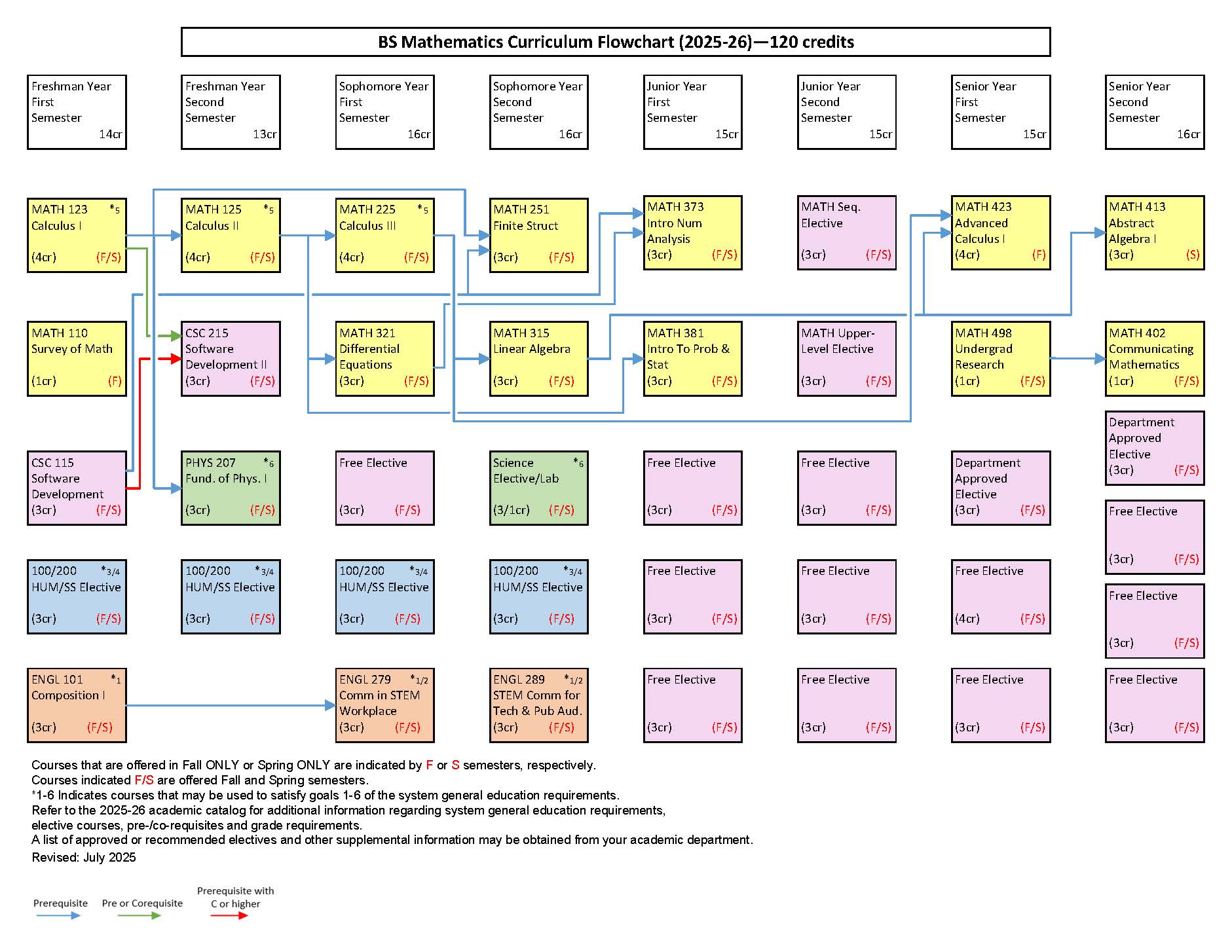 1 Fulfills General Education requirement. Students should consult the “General Education Requirements ” section of this catalog for a complete listing of all general education requirements. 2 The CSC 115 requirement can also be fulfilled by either CSC 150 or CSC 170 . The CSC 215 requirement can be fulfilled by CSC 250. However, to prevent prerequisite conflicts with potential later electives, it is recommended that Mathematics majors take CSC 115 and CSC 215. 3 Select one course from BIOL 151 , BIOL 153 , CHEM 112 , CHEM 114 , GEOL 201 ,or PHYS 209 , and one lab in BIOL 151L , BIOL 153L , CHEM 112L , CHEM 114L , PHYS 207L , or PHYS 209L (GEOL 201/201L must be taken co-requisitely regardless). 4 Select three credits from the MATH Sequence Elective list below. 5 Select three credits from the MATH Upper-Level Elective list below. 6 Select six credits from the Department Approved Elective list below. MATH Sequence Electives