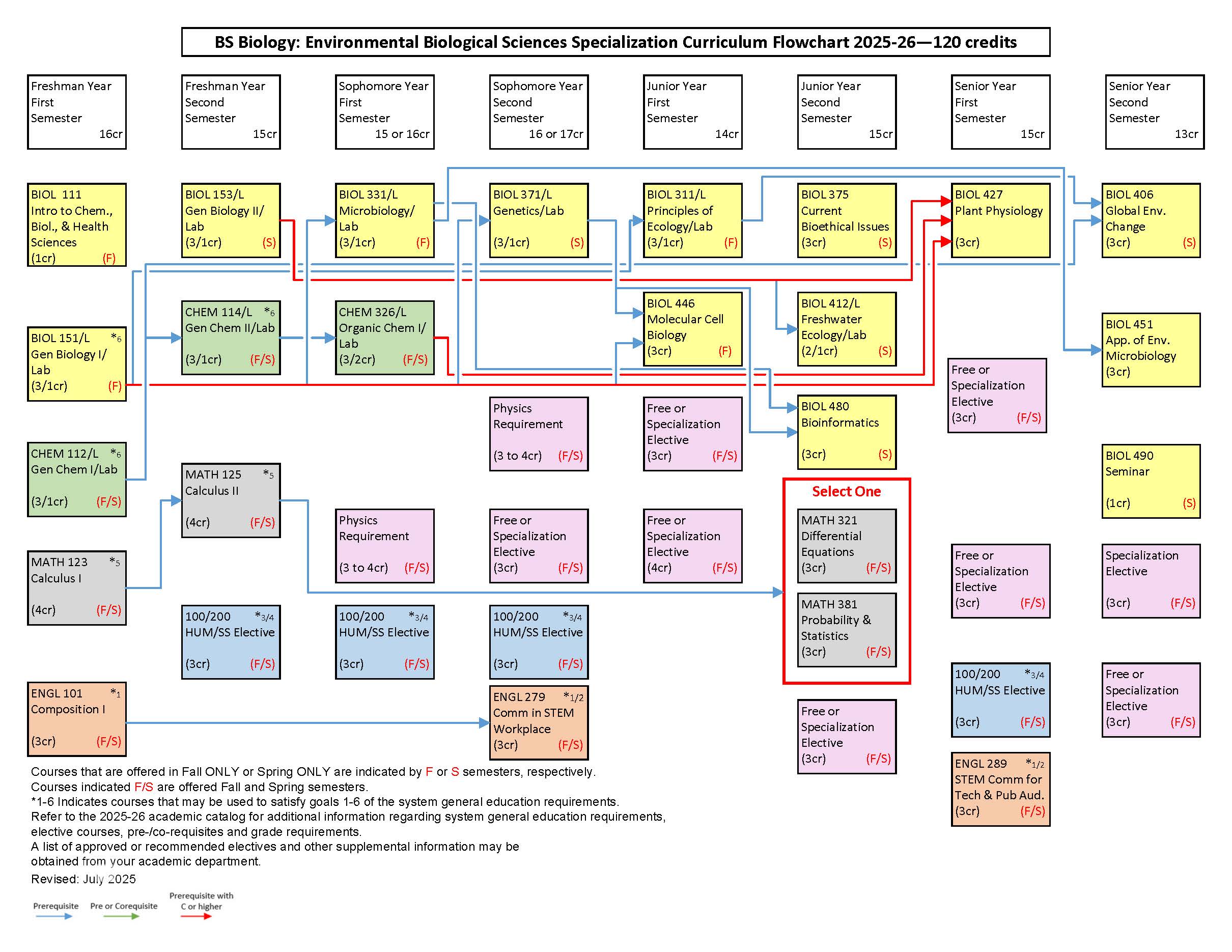 1 Fulfills General Education requirement. Students should consult the General Education Requirements section of this catalog for a complete listing of all general education requirements. 2 The Physics requirement must include two lectures and at least one lab, for a total of seven credits. Courses must be selected from: (PHYS 111 , PHYS 111L , PHYS 113 , PHYS 113L ) or (PHYS 207 , PHYS 207L , PHYS 209 , PHYS 209L ) or (PHYS 211 , PHYS 211L , PHYS 213 , PHYS 213L ). 3 Only one credit required for major. 4 Thirteen credits, or as needed to meet 120 credits total, of free electives are required for the degree. 5 Twelve credits of specialization electives are required for the degree. 6 Course is offered on a rotational basis. Contact department for questions on course offerings. Specialization Electives: